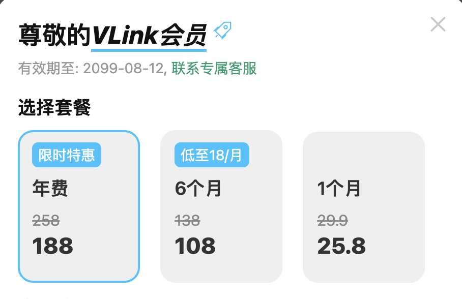 目前VLink会员定价为: 月费25.8 | 6个月108 | 年费188 开通后,您将解锁高级功能如下: