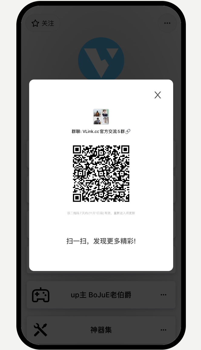 微信、群聊、小程序、公众号等任意二维码都可以通过VLink进行展示 (1)点击“添加更多模块”,弹出模块拓展 (2)点击“二维码” (3)输入二维码标题,并点击“上传二维码”,一个二维码就添加成功了。 点击即以弹框的形式展示您刚刚上传的二维码,效果如下: