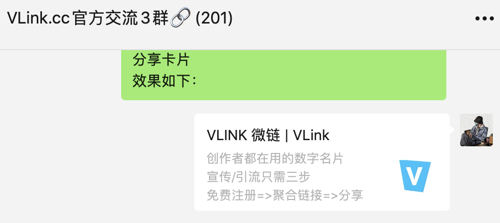 (1)微信中点击vlink页右上角...分享 (2)长按二维码再次进入页面 (3)再点击微信右上角的分享,转发,效果如下: