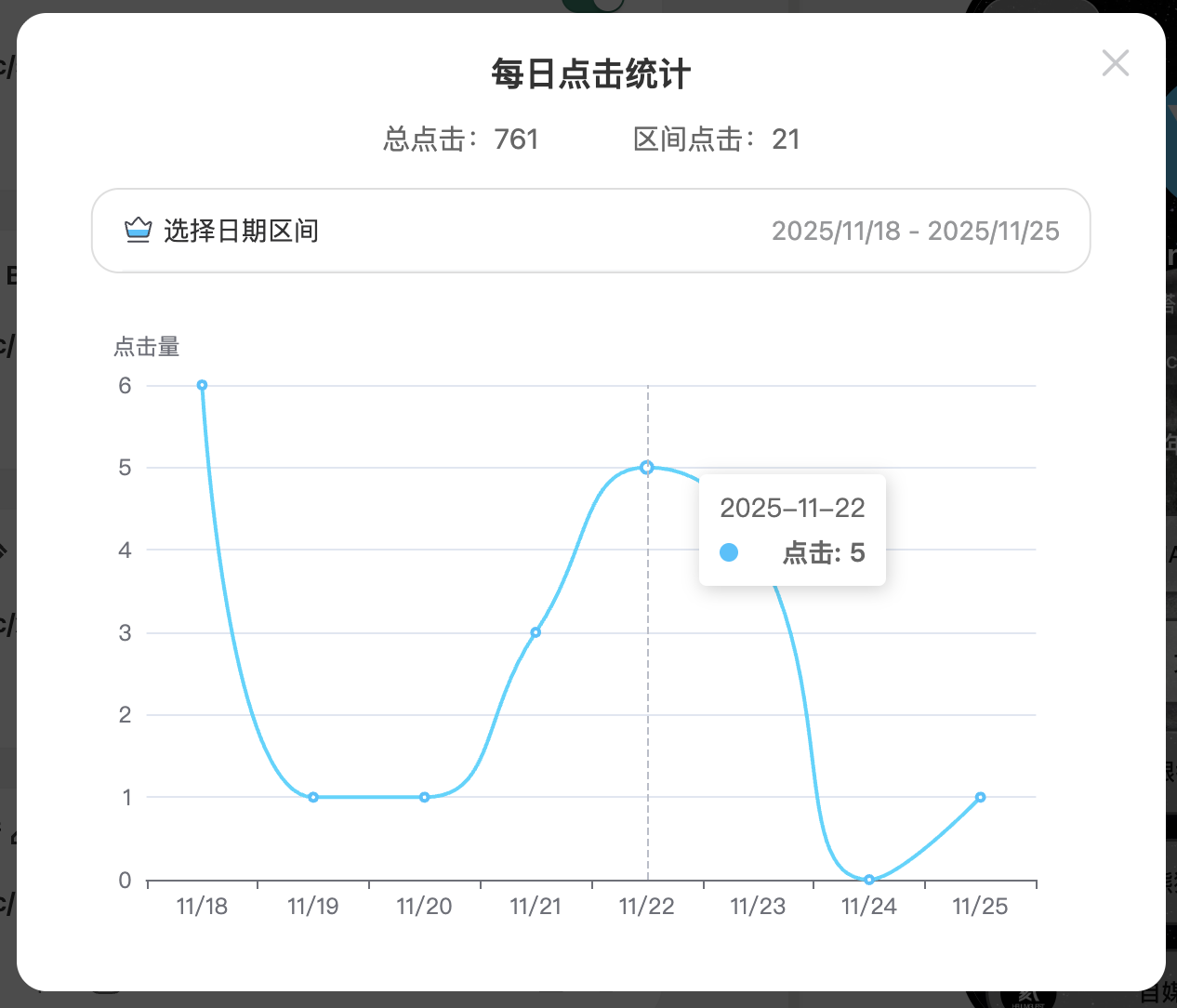 (2)点击后,显示了该链接的总点击次数,和所选区间内的点击次数