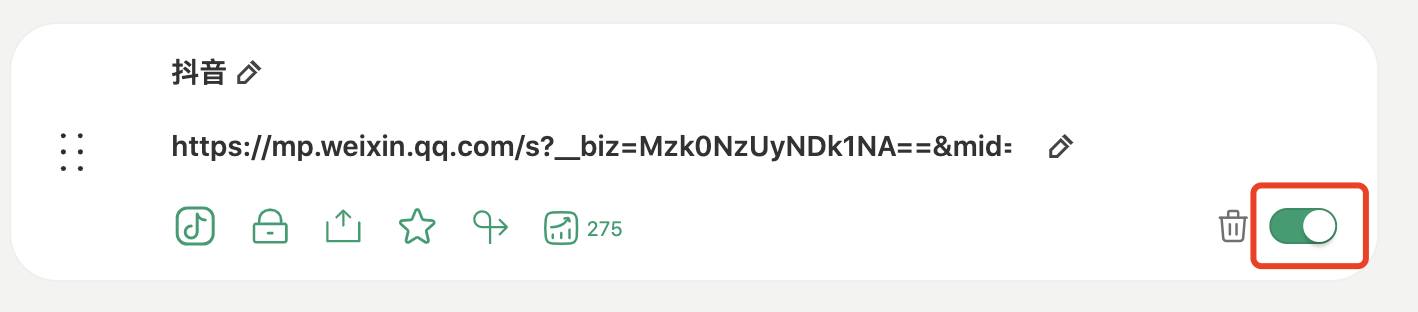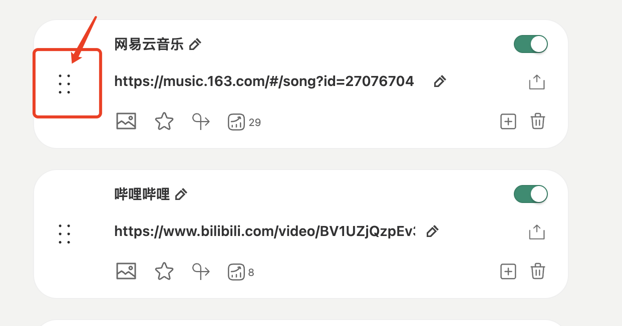如果您添加了多个链接,想改变链接在您页面上的展示顺序,按照下面操作即可 (1)按住卡片左侧“六个点的图标”,上下拖拽即可改变链接排列顺序
